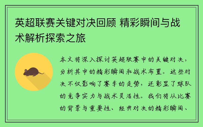 本文将深入探讨英超联赛中的关键对决,分析其中的精彩瞬间和战术布置。这些对决不仅影响了赛季的走势,还彰显了球队的竞争实力与战术灵活性。我们将从比赛的背景与重要性、经典对决的精彩瞬间、战术分析与球队表现、以及对未来的影响等四个方面进行详尽的回顾和探讨。通过对这些方面的研究,我们可以更全面地理解英超联赛的魅力与深度。